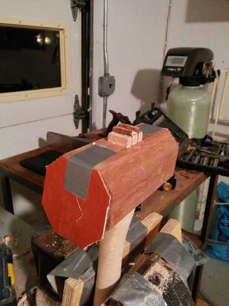 Casi listo! Mientras que en las cuñas del secado del pegamento, trazar los extremos de la cabeza de mazo en algunos cuero y cortar las piezas. Estos aferrarse con cinta, frotar poco de pegamento en los extremos, coloque la piel hacia abajo y el uso de que algunos bloques de madera de la abrazadera hacia abajo.