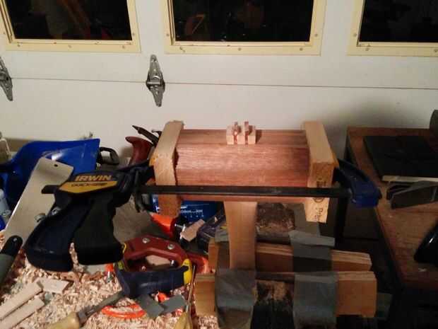 Por ahora el pegamento sobre las cuñas se debe virar para arriba y usted puede aprovechar la oportunidad para cortar la cuña y la espiga al ras.