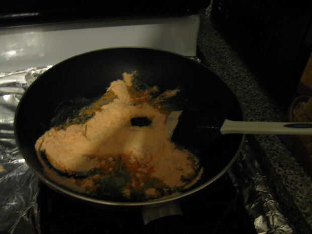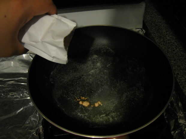 Después la mantequilla se haya derretido, vierta en el polvo de naranja misterio en la cacerola y alrededor con su espátula.