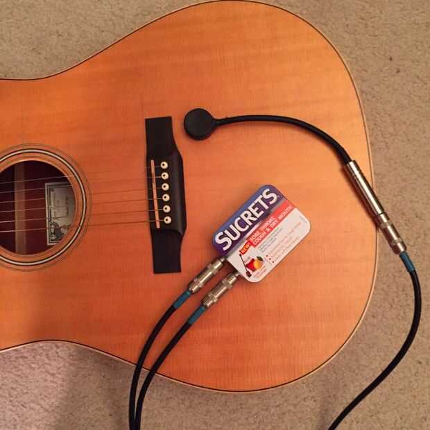 Puede utilizar este micrófono de contacto como una camioneta para un instrumento acústico como una guitarra. Si lo hace, usted probablemente querrá usar un cable más largo de 8", para que el gato elimina la parte superior. Para sujetar el micrófono de contacto a la guitarra, usar un poco de masilla de montaje de cartel. Usted puede asegurar aún más el mic y el cable con cinta adhesiva, que tiene bien pero no deja un residuo cuando se saca. Se puede experimentar sobre dónde colocar el micrófono para obtener el mejor sonido, pero justo por debajo del puente en el lado de las altas cuerdas funciona bastante bien.