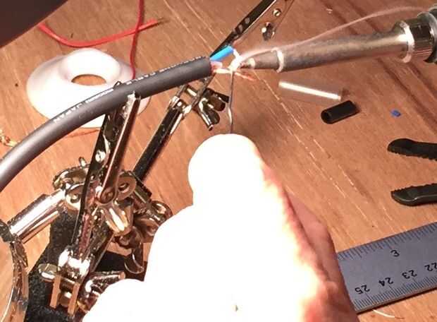 Antes de conectar los cables a los bornes de la toma, se deben "la lata" los cables aplicando una pequeña cantidad de soldadura para los cables. Utilizar una herramienta barata de "ayudando a mano" con pinzas de cocodrilo para mantener mi trabajo, mientras que la soldadura.