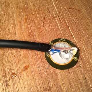 El piezo y montaje del cable en la tapa de la botella para que sea uniformemente al ras con el borde de la sostenga en su lugar hasta que el pegamento esté firme. Es importante que usted como cerca al ras posible, para que el piezo hacer buen contacto con una superficie. Aplicar un anillo de pegamento caliente alrededor de la articulación entre la tapa y el cable.