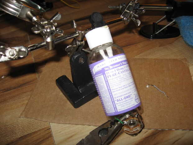 Estamos trabajando todavía simplemente con sólo el tapón de botella de plástico, elemento de micrófono y el condensador. No soldarlos a los TRS hembra base, todavía! A continuación, necesitará conectar los cables con su condensador (con dos cables) a otro conjunto de cables para extender hasta el fondo TRS hembra. Permitir que estos cables dar cierta holgura en el caso de usted necesita girar la tapa para hacer reparaciones.