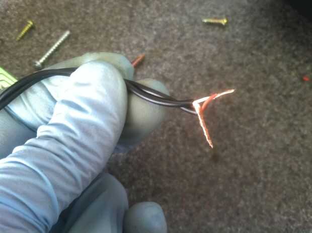 Enganche los cables y dejar unas pocas pulgadas del cable de entrada (el uno con el conector verde)