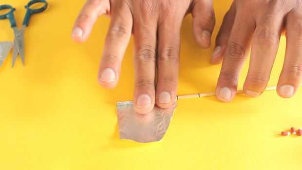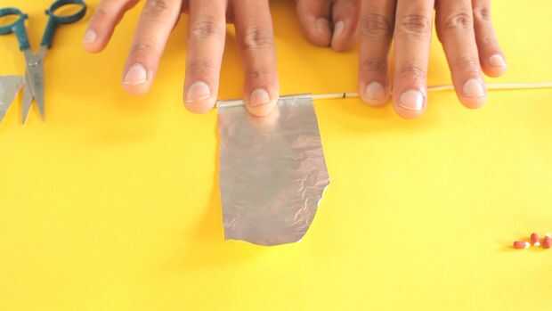 Ahora toma la parte de corte de aluminio y coloque la brocheta de madera o una aguja que marcó anteriormente sobre el papel y asegurar que la línea trazada en 3 cm tocando el extremo de la hoja como se muestra y coloque la cabeza de la cerilla sobre él y la hoja del rodillo con cuidado