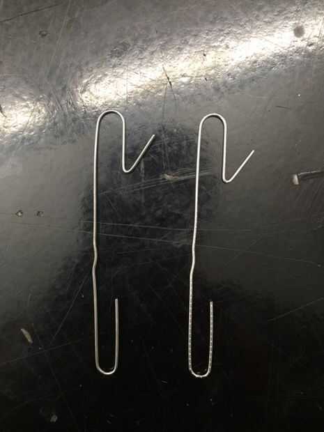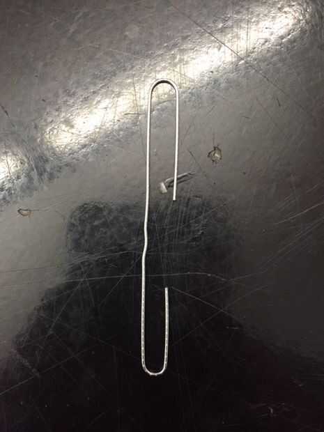 Tome el pequeño bucle en el interior del clip de papel y dóblela hacia abajo hasta que el clip quede derecho con un gancho en cada extremo. Para ello una segunda vez para el segundo clip de papel. En el gran gancho de cada clip doblar detrás hacia arriba para crear otra apuntando hacia arriba. El clip de papel sería como el de esta imagen.