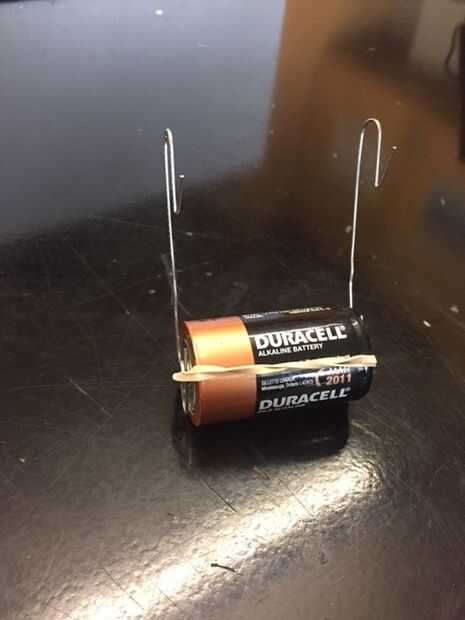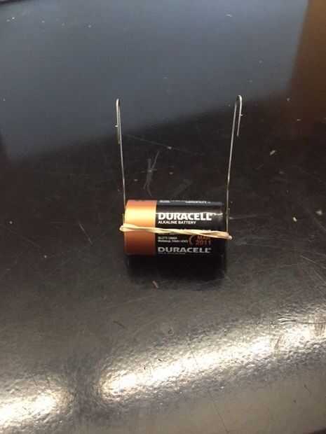 Colocar los clips de papel en los lados de la batería y envolver la cinta de goma alrededor de él, manteniendo los clips a la batería. Asegúrese de que sus ganchos son hacia arriba. Hasta ahora el proyecto debe parecerse a la primera foto. Coloca el anillo de alambre en los ganchos con el exceso de cable en los ganchos. Mira la imagen si quieres ver lo que debe. Coloque el imán en el alambre, se conecta a la batería.