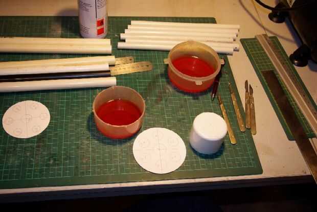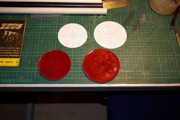Luego viene a los espaciadores de barril. Usé dos plantillas de la tarjeta y cuidadosamente dibujó y marcado los espaciadores. Estos se cortan y miré a mi alrededor para dos tinas de plástico de diámetro similar. I vierte la resina en las cubas a una profundidad de aproximadamente 1/4" o 6mm y dejaron para la curación.
