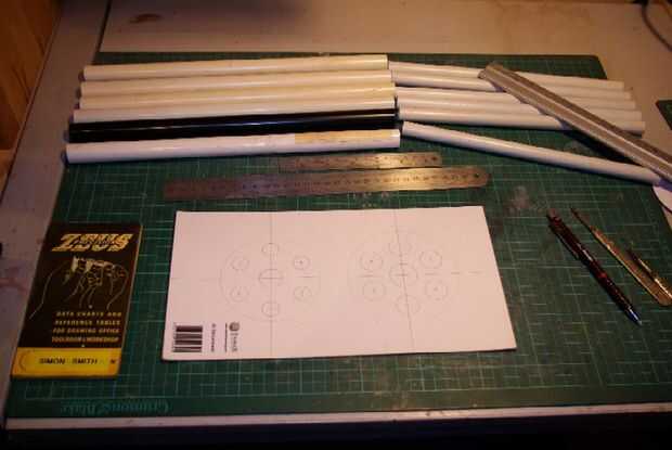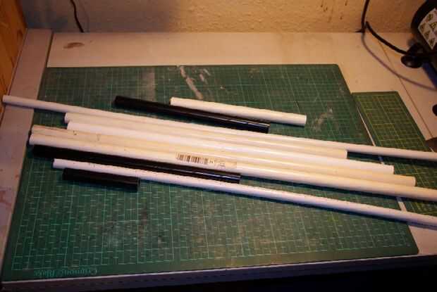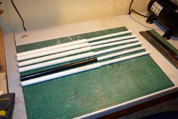 Los componentes principales de mis barriles son longitudes de tubería de PVC para fontanería y enlace del cable. Lamentablemente ninguno de ellos era suficientemente largo individualmente para que coincida con los barriles correcto por lo que hay 6 longitudes del tubo de 20mm y luego 6 longitudes de tubería de 15mm para formar los barriles. El eje central está hecho de una longitud de conducto de 25mm.