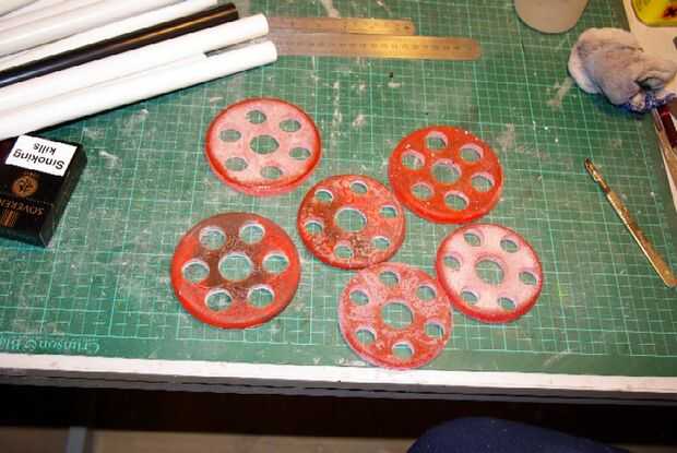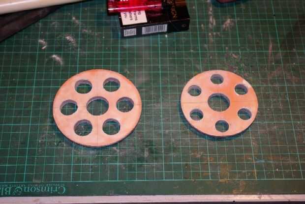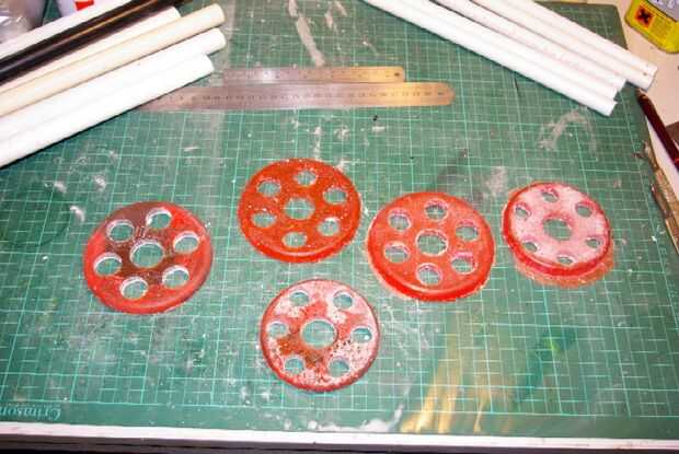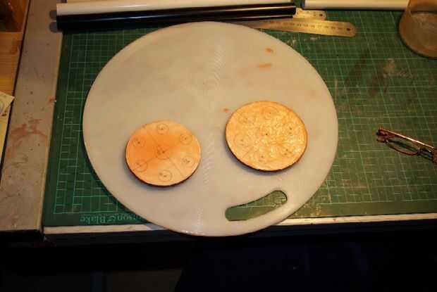 Una vez que tuve los dos curaron resina 'discos' pegado las plantillas a ellos, les dio una capa de resina para protegerlos y cuidadosamente perforar los orificios y limpiaron para arriba.