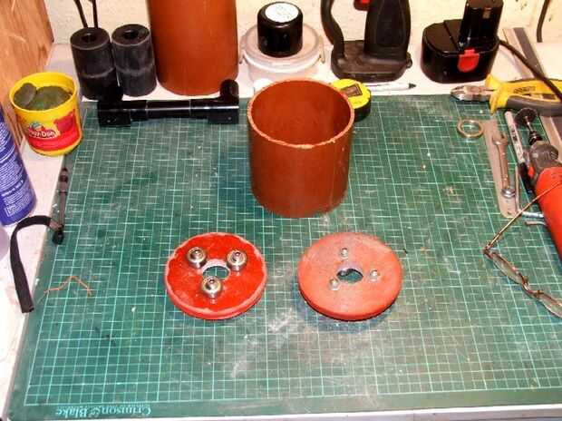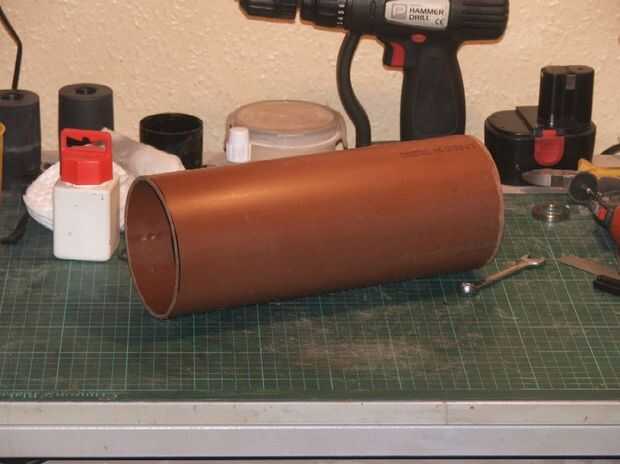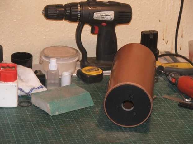 El cuerpo principal es un pedazo de tubo de 4"/ 160mm suelo, usted puede comprar tapones para adaptarse a estas cosas pero no tengo ninguna así que usé una cortada a los extremos del molde en resina. Otra vez hice una plantilla de la tarjeta con el centro marcado en él para después de la perforación. No se molestan en hacer un molde, acaba de hacer dos extremos usando el cut off como un molde de la pipa. Estos fueron taladrados y lijados con un orificio central con un diámetro de 27mm a 1mm de espacio todo el eje del barril. Los extremos se asegurará con tornillos autoroscantes una vez que todo ha sido probado.