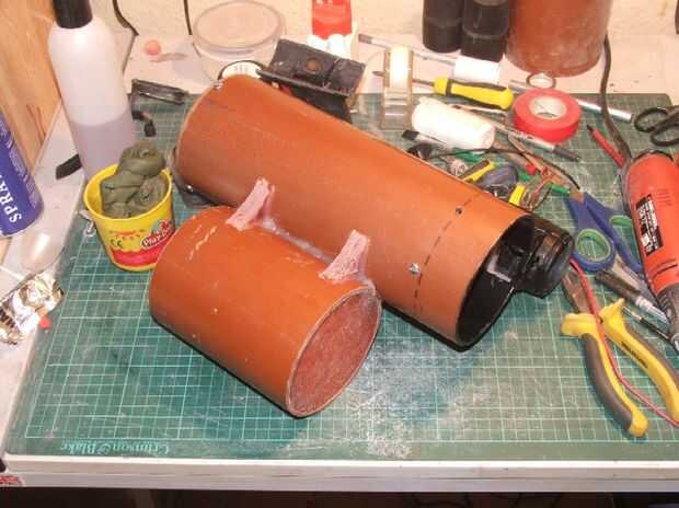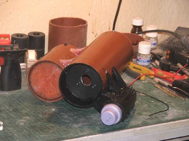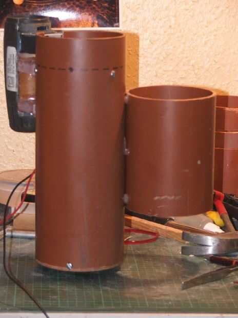 Sin embargo, no pude encontrar ningún tubo de 3", y como la suerte lo tendría, la batería original en su cubierta de plástico era un ajuste agradable dentro de la bajante 4" había usado para el cuerpo. Decidí utilice en su lugar, y aunque es realmente un diámetro demasiado grande para ser exacto pensé que podía disimular más adelante con algunos adornos.