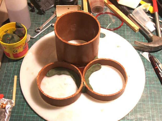 Yo corte una sección de tubería aproximadamente mitad de la longitud del cuerpo, alineados en el Banco y viró con 6 gotas de hot-melt. Luego usé los anillos des corte de tubería de desecho que queda de cortar la alimentación para hacer un molde y fundido un conjunto de pequeños Yugos. Estos se pegan y las juntas se ejecutan con derretimiento caliente para sellar y reforzar todo.