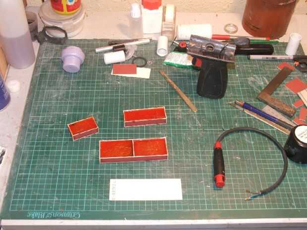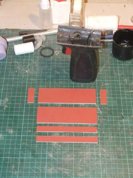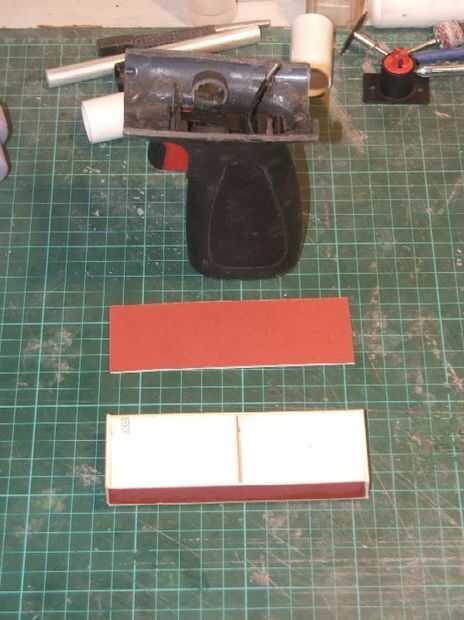 Comencé creando las tres cajas rectangulares para las partes traseras (uno cae por debajo de la placa de la cacha y se utilizará para sujetar el tapón del extremo del cuerpo principal). Estas fueron cortadas de tarjeta de alta densidad de 1,5 mm de espesor y pegado con pegamento de uso general. Una vez estaban llenos de resina y fibra mate y permite curar.