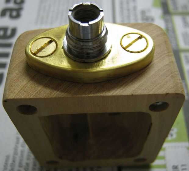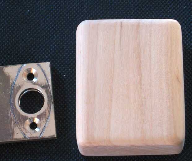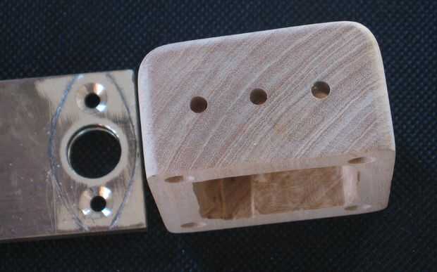A continuación la placa base de latón para soldar el conector 510 fue cortada y en forma. Se perforó y las posiciones de los orificios marcan en la madera.