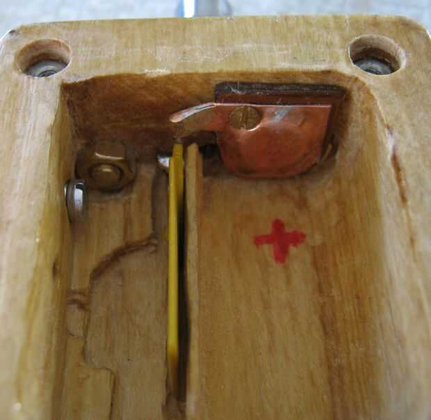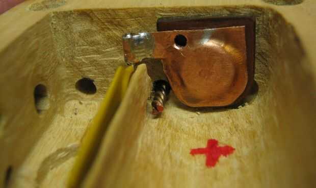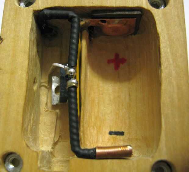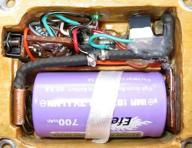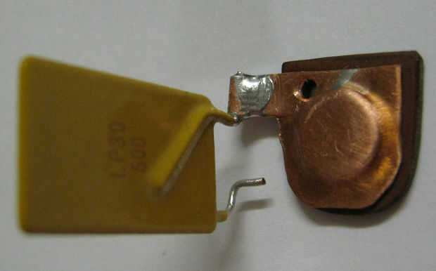 Los contactos de la batería fueron cortados de la hoja de cobre amarillo, pos soldadas a los fusible reseteable y negativo a la pata de la fuente de lo mosfet.