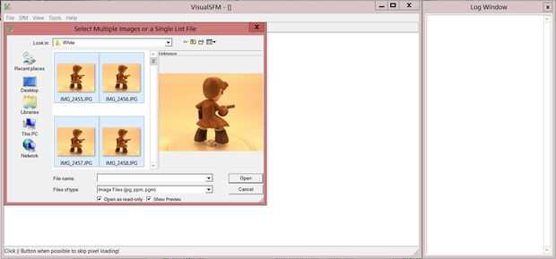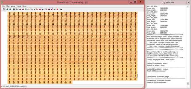 Se puede utilizar ya sea el "archivo -> abrir + imágenes múltiples" o el tercer botón de la izquierda que parece una carpeta azul con un signo más. Se abrirá una ventana del navegador en busca de imágenes. Directo a la ubicación de las fotos que tomó de su modelo. Seleccione todas las imágenes y "Open" del golpe. Esto mostrará las miniaturas de cada imagen subida. Usted puede alejar para ver todas las fotos. Puede haber algunos marcos vacíos porque el programa está diseñado para ahorrar memoria. Puede cargar estas imágenes que faltan mediante el uso de "SfM -> más funciones -> Color de punto de actualización" y una vez su uso hecho "SfM -> más funciones -> actualización de miniaturas".