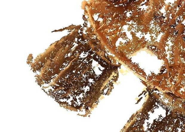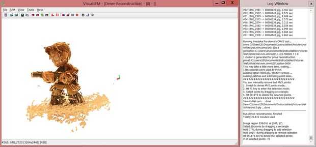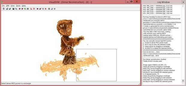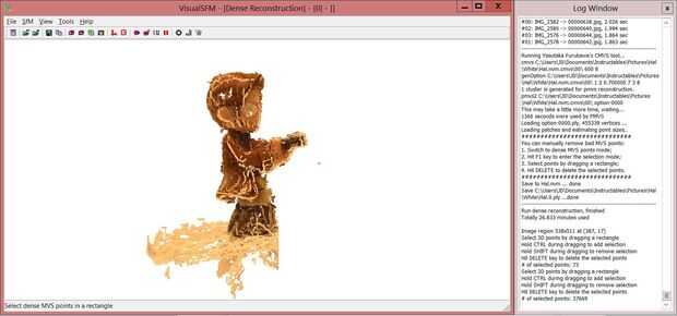 Una vez terminada la operación anterior sólo tendrá que pulsar la tecla "Tab" para ver los resultados. Aquí usted puede ver que la reconstrucción densa se ve casi exactamente igual que el modelo, solo con unos espolones extras de puntos. Para eliminar estos estímulos extras y limpiar el modelo Presione la tecla "F1" y seleccione los puntos. Todo lo que está dentro del rectángulo se seleccionarán. Presione "Delete" y los puntos seleccionados se eliminarán. Continúe esto hasta que estés feliz.