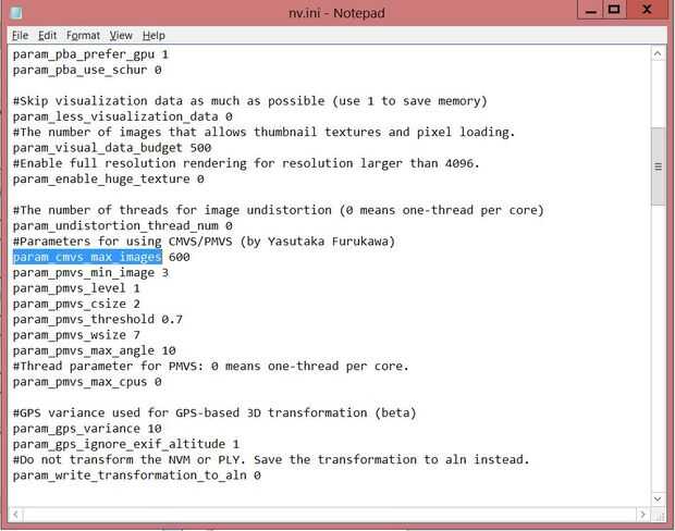 En la misma carpeta que el programa MFS Visual debe haber un archivo llamado "nv.ini". SFM visual tira todas sus configuraciones para ejecutar desde aquí. Si está utilizando un gran número de archivos, como yo, que necesitaba cambiar un número para obtener un archivo de salida única. Usted debe ser capaz de abrir el archivo con un editor de texto (.txt). Busque la línea "param_cmvs_max_images" y cambiar el número a algo mayor que el número de fotos que tengo.