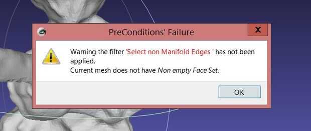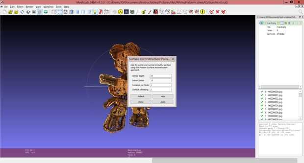 En la barra de menú, haga clic en "filtro -> configuración de puntos -> reconstrucción de la superficie: Poisson". Se abrirá una ventana pronto donde debe cambiar los parámetros de "Profundidad del Octree" a 10. El "Solver se Divide" y "Muestras por nodo" necesita jugar con para crear una malla decente. "Muestras por nodo" ayuda a crear una malla suave, como se puede ver en las capturas de pantalla. Confían en usar 4 "muestras por nodo". A continuación, haga clic derecho sobre el primer elemento en el menú de capas y eliminarlo. Por último, tenemos que borrar los bordes no-múltiple, "filtros -> Selección -> seleccionar bordes no múltiples". Cuando hago esto me sale un mensaje de error porque tengo un cuerpo sólido