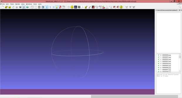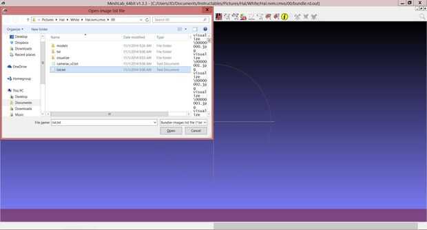 Haga clic en el segundo icono desde la izquierda (carpeta con tres documentos horizontales). Vaya a [filename].nvm.cmvs/00 carpeta, elija "bundle.rd.out" y abrir de golpe. Luego se abre otra ventana donde tienes que elegir "lista.txt", luego abrir de golpe. Puede tardar un minuto o dos para abrir este archivo, dependiendo de cuántas imágenes que utilizó.