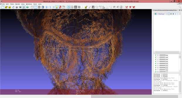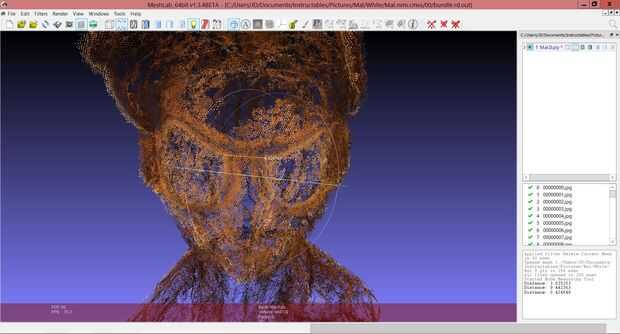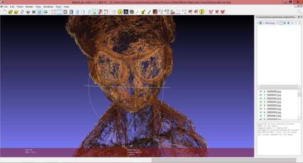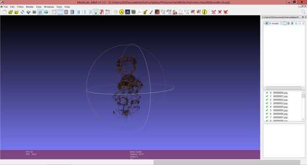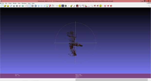 Una vez que se abre se necesita eliminar la nube de puntos a importar su limpio para arriba de la nube de puntos denso. Para ello necesitará presionar el botón de "Capas", séptimo por la izquierda (varias hojas de papel horizontal). Abrirá una ventana en el lado derecho de la pantalla. Haga clic derecho sobre ".0.ply [nombre de archivo]", donde un menú aparecerá y elegir "Eliminar malla actual". La nube de puntos dispersos desaparecerá. Ahora necesita hacer clic en el tercer botón de la izquierda (carpeta con flecha en), desplácese hasta el archivo que guardó en el paso pasado de SfM Visual y abrirlo.