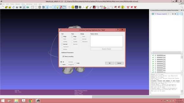 Lo último que va a hacer en MeshLab es guardarlo para que usted pueda utilizar en Blender. El botón para esto parece guardar el típico botón de un disquete. Cambiar el nombre del archivo de modo que nada puede rehacer si es necesario. Saqué el ". 0" entre el nombre y la .ply.
