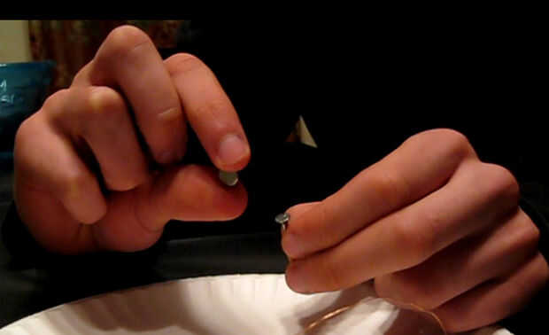 Mantenga la paja vertical cerca de 1 pulgada (2 centímetros) de la superficie de trabajo. Tome el imán de disco súper fuerte y deje que se adhiera directamente a la cabeza plana de la uña.