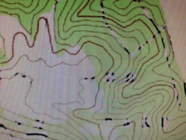 2. limpiar el mapa: usando un poco el editor de mapas (utilicé CorelDraw) necesita eliminar todas las líneas oscuras excepto las líneas de contorno. Ver las fotos de dos detalles, uno antes de quiten las cosas extrañas, el otro después. Tenga en cuenta que quité también los números de elevación. La siguiente foto muestra el mapa topográfico completo con cosas extrañas quitado. Tenga en cuenta que no estaba super cuidado en limpiar la imagen. ¿Cuánto es suficiente? El siguiente paso será decirle.