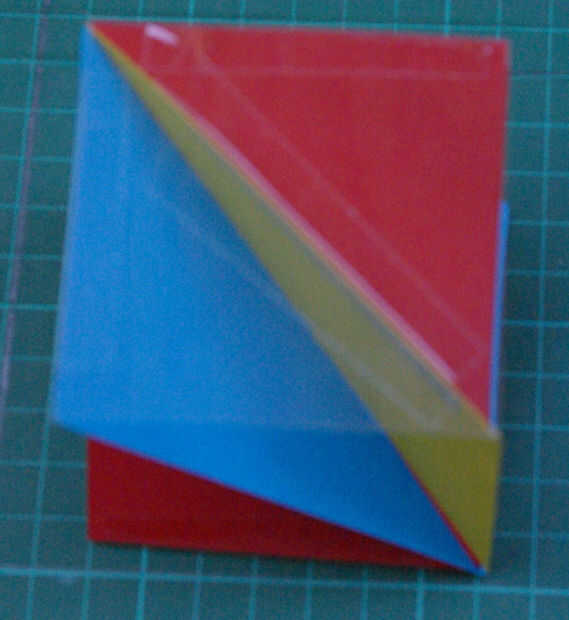 Deslice un rectángulo en la otra a lo largo de las ranuras diagonales en ellos. Y los planos de los dos rectángulos con un ángulo de aproximadamente 120 grados/60 grados entre sí cuando se ve a lo largo de su común diagonal.
