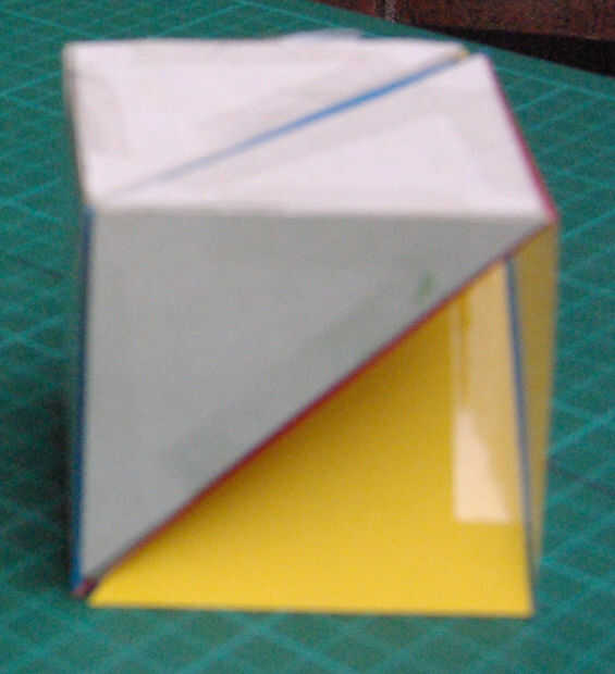 Mirar directamente hacia abajo en las caras del cubo y, excepto por las dos caras del cubo con un cuadrado de plástico adjuntado, asumir que todas las caras del cubo están presentes. Entonces uno ve que cada cara tiene en sus superficie dos tetraedros adyacentes con dos caras de cada tetraedro ángulos rectos entre sí. Tenga en cuenta también que todas las cuatro caras de los tetraedros se componen de triángulos. Así el cubo original podría ser reconstruido de tales seis tetraedros.