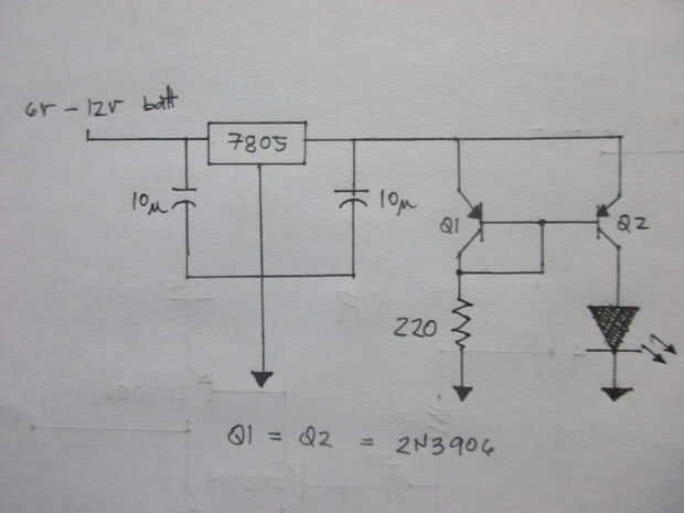 Mencioné anteriormente que sólo podemos abastecer los diodos con hasta 4, 5V como tensión de paso. Esto es principalmente porque estoy usando un regulador de voltios 5 antes de la etapa de transistor. Conexión de un diodo láser con un 5V tensión directa puede forzar el transistor Q2 para funcionar en saturación pues no hay más tensión a su Vec. Para enviar un máximo de 4, 5V Voltaje de un diodo asegura que los transistores están en región activa delantera y ajustes actuales son todavía posibles. Si desea utilizar diodos con mucho avance tensiones superiores, puede sustituir el regulador con un 9V uno, una de 12 voltios o incluso una versión variable como el LM317. Sólo tienes que calcular el valor de la resistencia de nuevo.