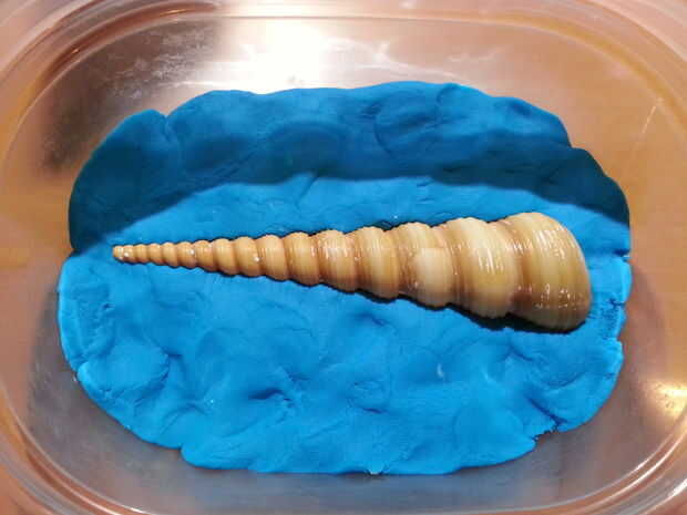 Tu Play Doh, o sustituir el material y el paquete en abajo dentro de su perímetro. Luego tomar el objeto y pulse aproximadamente a mitad de camino en la masa. Asegúrese de cubrir cualquier grietas interiores antes de insertar el objeto (pegué encima de la abertura de la concha)
