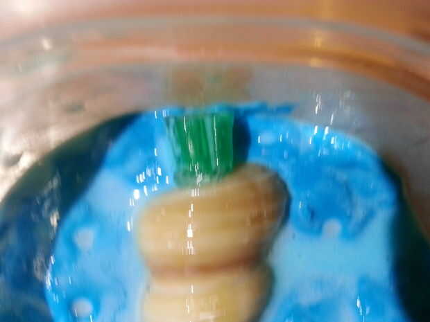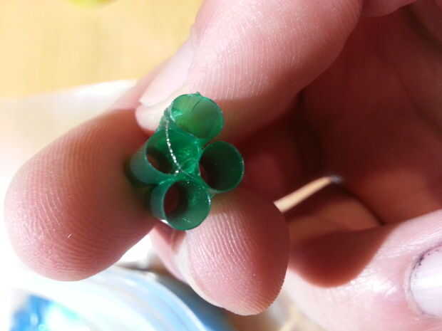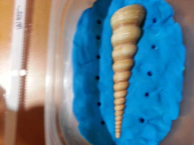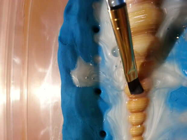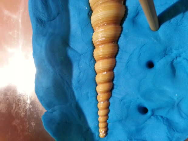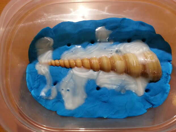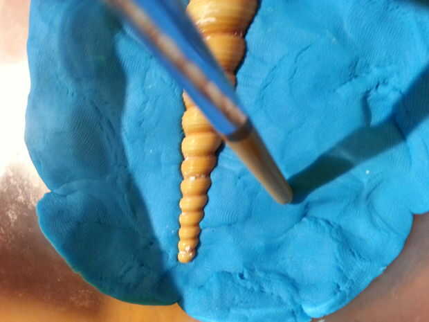 Si el objeto no tiene una base plana o no toque el perímetro, es importante crear un tubo artificial que se puede verter material fundido una vez que el yeso se seca. He creado mi cortando y pegando cuatro secciones de una pajita y colocarlos en la parte superior de la concha. Como se muestra en la imagen, no tiene que tocar totalmente el borde. Es fácil de romper cualquier capa fina de yeso se acumula allí.