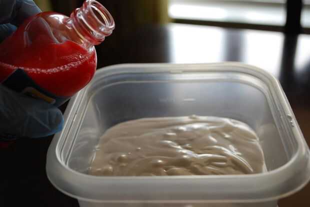 Una vez añades en el catalizador, es el momento de la mezcla. El goop no querrán mezclar al principio y quedo con un poco de músculo, pero si quedarte con él y seguir mezclando, terminarás con un líquido color rosa suave con la consistencia de la miel ligeramente gruesa.