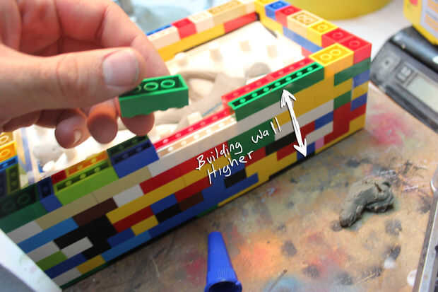 Cuando esculpido mi primer semestre en la arcilla de modelado no hacerlo suficientemente gruesa en general. Permite crear el muro con el otro pocas capas de Legos para que obtenemos el espesor en la segunda mitad del molde que necesitamos. Si fuera inteligente hubiera acertado la primera vez :( No te preocupes esta es la solución!