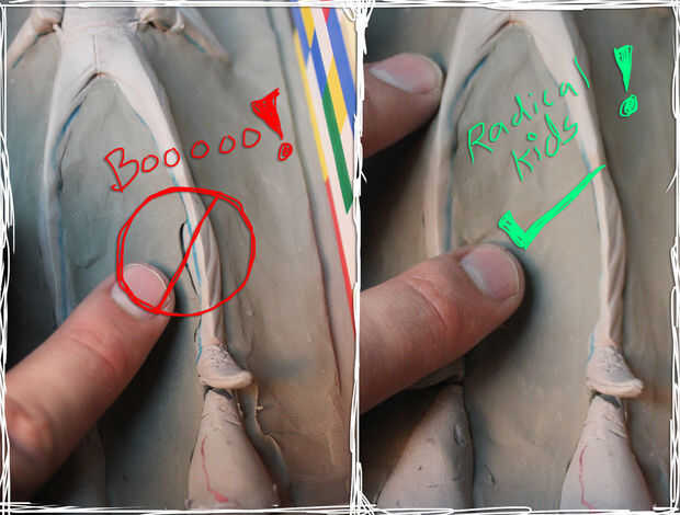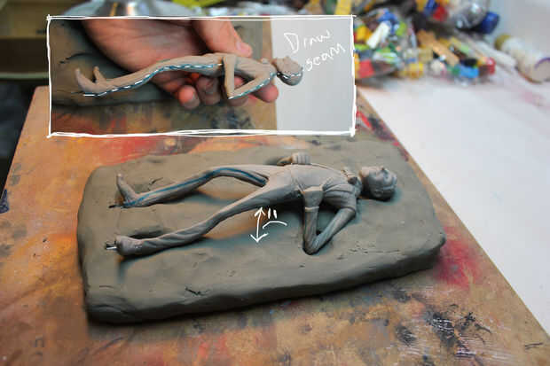 Presiona la arcilla agradable y ajustada a la escultura porque Moldmax 14NV tiene una baja viscosidad (lo que significa que es muy líquida). Por lo que es importante que presione firmemente en toda la arcilla alrededor de las costuras para que la goma no escapa cuando vertemos en la primera mitad.