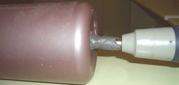 Anteponer la masilla un poco sobre el perno. Inserte el perno en sostenedor del pedacito de destornillador. Cubrir toda la junta con masilla. El masilla más mejor el molino de bola se queda juntos.