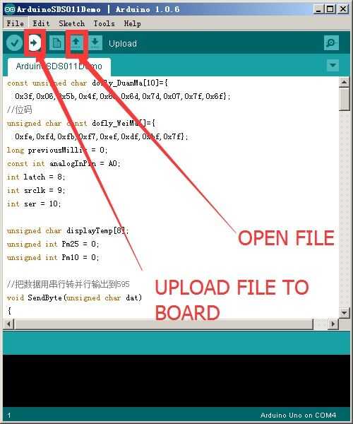 Abra el archivo "ArduinoSDS011Demo.ino" y subir. el archivo sería automáticamente compilado y subido a la placa arduino.