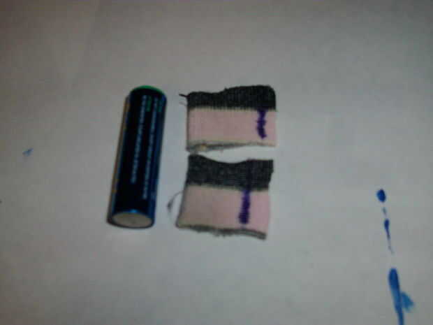 Ahora hacer las orejas. Cortar dos rectángulos y me les dobla sobre para que un lado ya estaba hecho. Luego cosí encima otros dos lados, dejando un lado abierto. Después de que convertía derecho-lado-hacia fuera e hicieron una forma de gran oído. En esta foto pongo las plazas junto a una batería AA para mostrar cuán grande son. La segunda foto es lo que se ven como aftherles cosí.