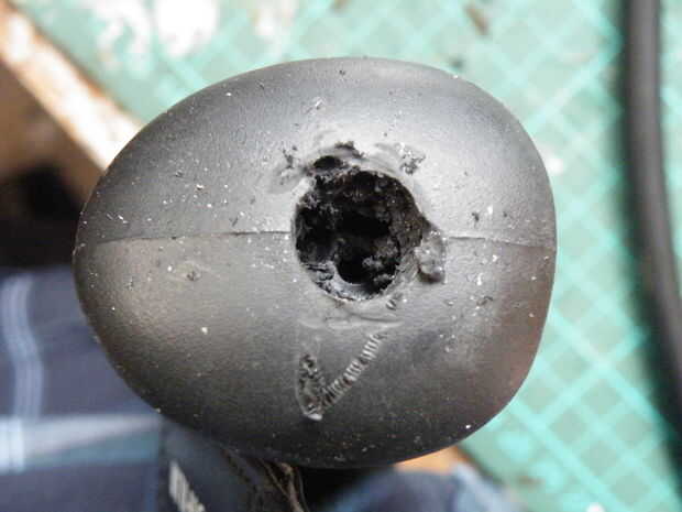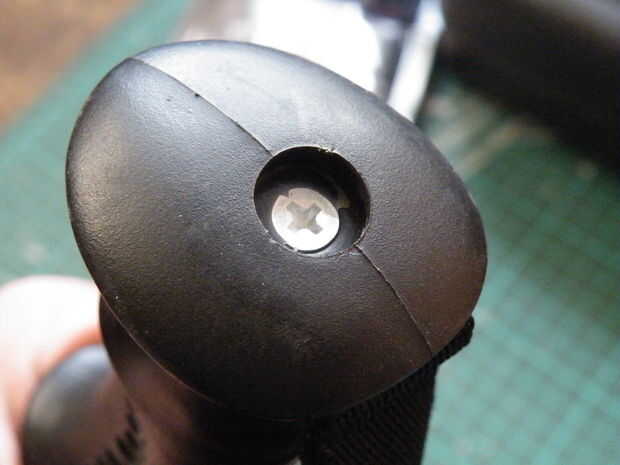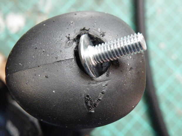 Me di cuenta que el plástico de la manija era bastante flexible, por lo que evita hacer el agujero cualquier furtling más grande, todo dentro del agujero en su lugar, ensanchar el agujero debajo de la superficie a tomar la cabeza del perno.