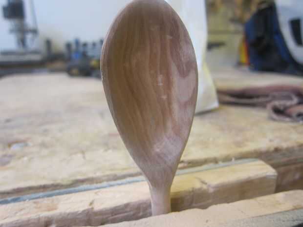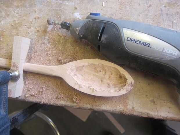 Usar una fresa de talla en una herramienta giratoria para aproximadamente forma el interior de cada cuchara. Hacer un montón más de lijado para suavizar la cuchara, esta vez totalmente a mano. Alternar entre sosteniendo la cuchara en mi mano y en un tornillo de banco.