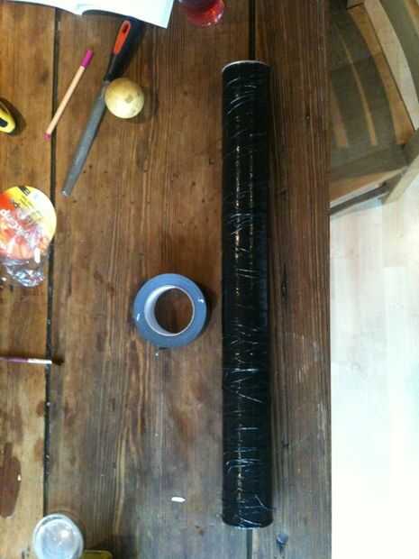 Paso dos: Coloque los tres tubos con uno en la parte inferior y los otros dos apilados en la parte superior para hacer uno largo sin cortar tubo (ver imagen). La cinta utilizando la cinta adhesiva. Tratar de alinearlos perfectamente como sea posible para hacer el tubo recto que se puede. Cubrir los tubos en al menos tres capas de cinta adhesiva, teniendo cuidado de asegurar que la cinta sobre la parte inferior varias veces y hacer las uniones herméticas. No lo hace y te sople la parte posterior de su mortero en el primer intento.