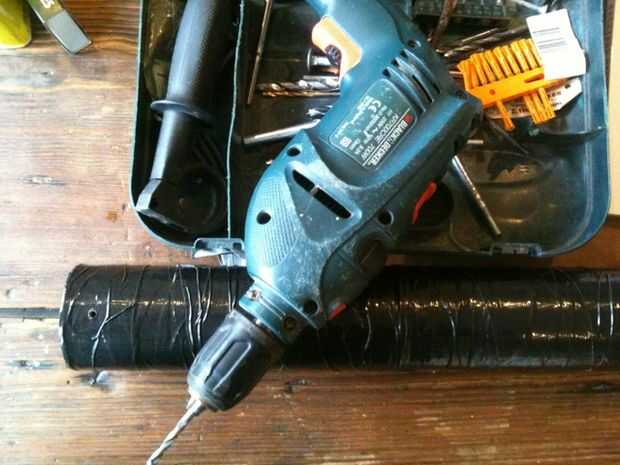 Paso tres: hacer su agujero de disparo aproximadamente una pulgada a 1,5 pulgadas desde la base del tubo largo. El agujero debe ser del tamaño de una pieza de cinco peniques. Usé un taladro, pero probablemente se podrían utilizar un punzón o tijeras mientras tienes cuidado de no dañar la integridad del tubo demasiado.