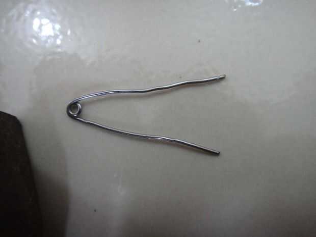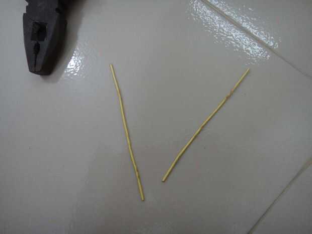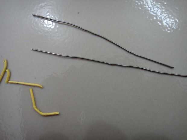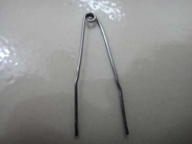 Ahora toma el papel de dos clips y enderezarlas con unos alicates. Si tienen aislamiento sobre ellos eliminarlos. Ahora doblarlos como se muestra en la imagen.