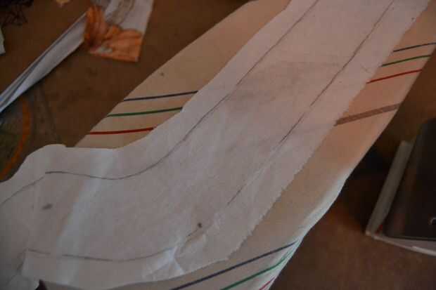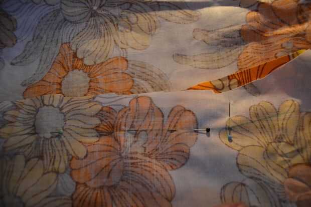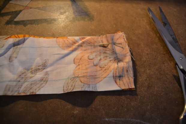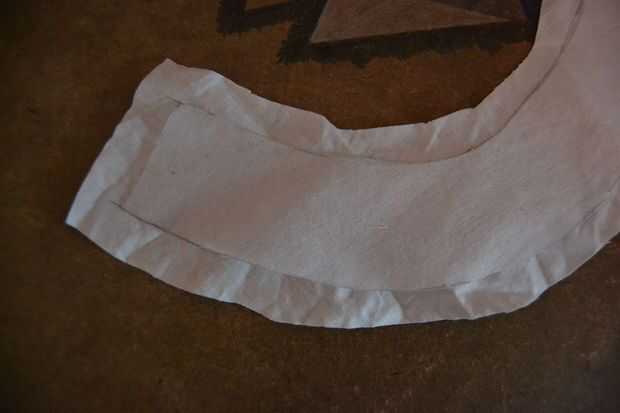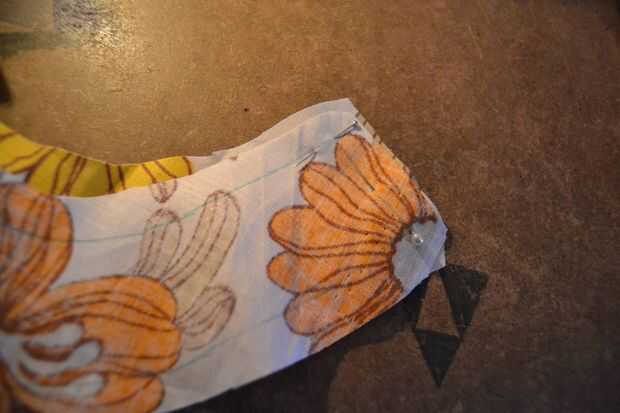ahora pin y luego coser las dos piezas cara con ninguna entretela juntos, coser las dos piezas cara con entretela juntos, coser cada una de las dos bandas de tela larga juntos en los extremos cortos, cerrar la costura de la falda y cerrar las costuras laterales y las costuras de los hombros en la parte superior.
