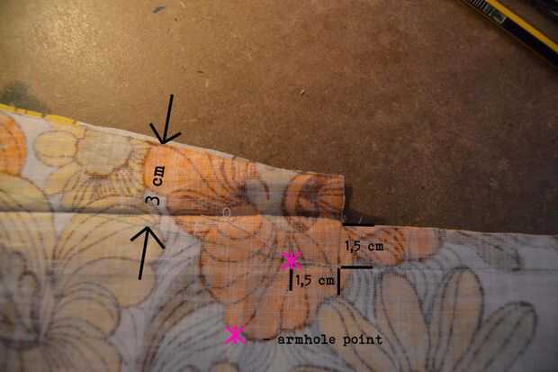 antes de empezar, ver que el margen de costura de la sisa como en la primera foto. Cuando usted Sobrehilar las costuras laterales, hacen la parte delantera y la parte posterior parte por separado y sólo donde el margen de costura 1,5 cm, ver segunda foto.