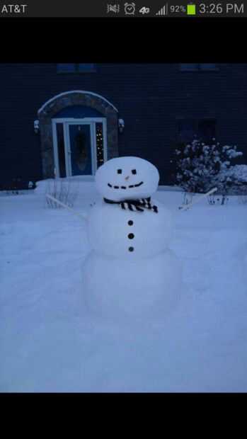Esto me dejó con un gran cubo compactado de nieve. Creo que mi par de guantes (que e hav un Goretex Palma) que se froten o esculpir el muñeco de nieve. Me ha sorprendido lo fácil que era hacer muñeco de nieve de muchos el método de balanceo. Los rasgos faciales se hacen de los cuadernos de papel negro que encontraron su camino a casa desde la oficina y unos tubos de PVC para los brazos. Ya llamé a la tienda de aplicación local que me guarde una caja de refrigerador y a probar
