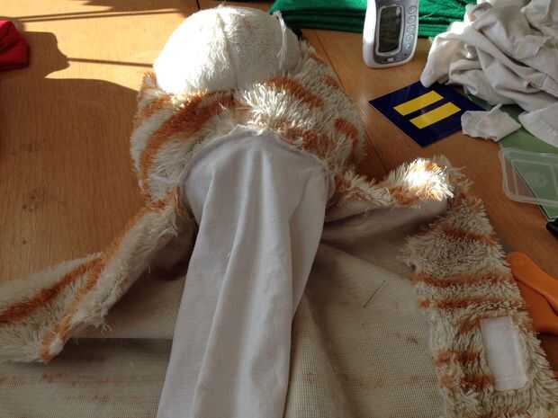 Aquí es lo que parecerá el interior de la marioneta.  Mi brazo irá dentro de la manga y mi mano voy a entrar en la cabeza del muñeco.