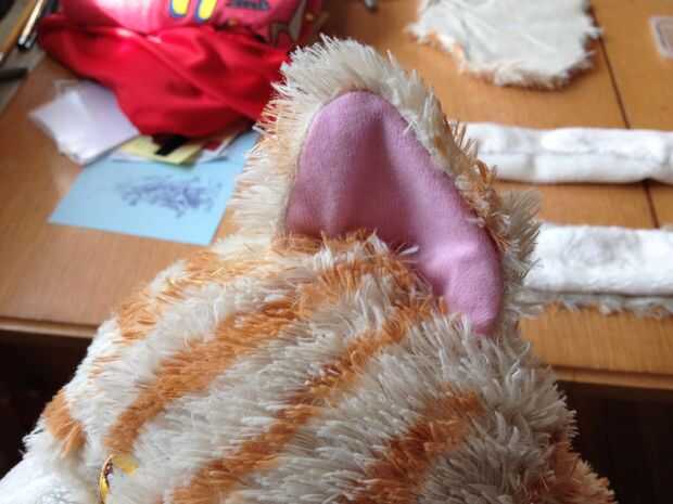 Las orejas son demasiado floja, así que corte un pedazo de la suspensión de capa fina, blanca y hacinados en cada oído.  Luego había doblado en forma de oreja de gato triangular.